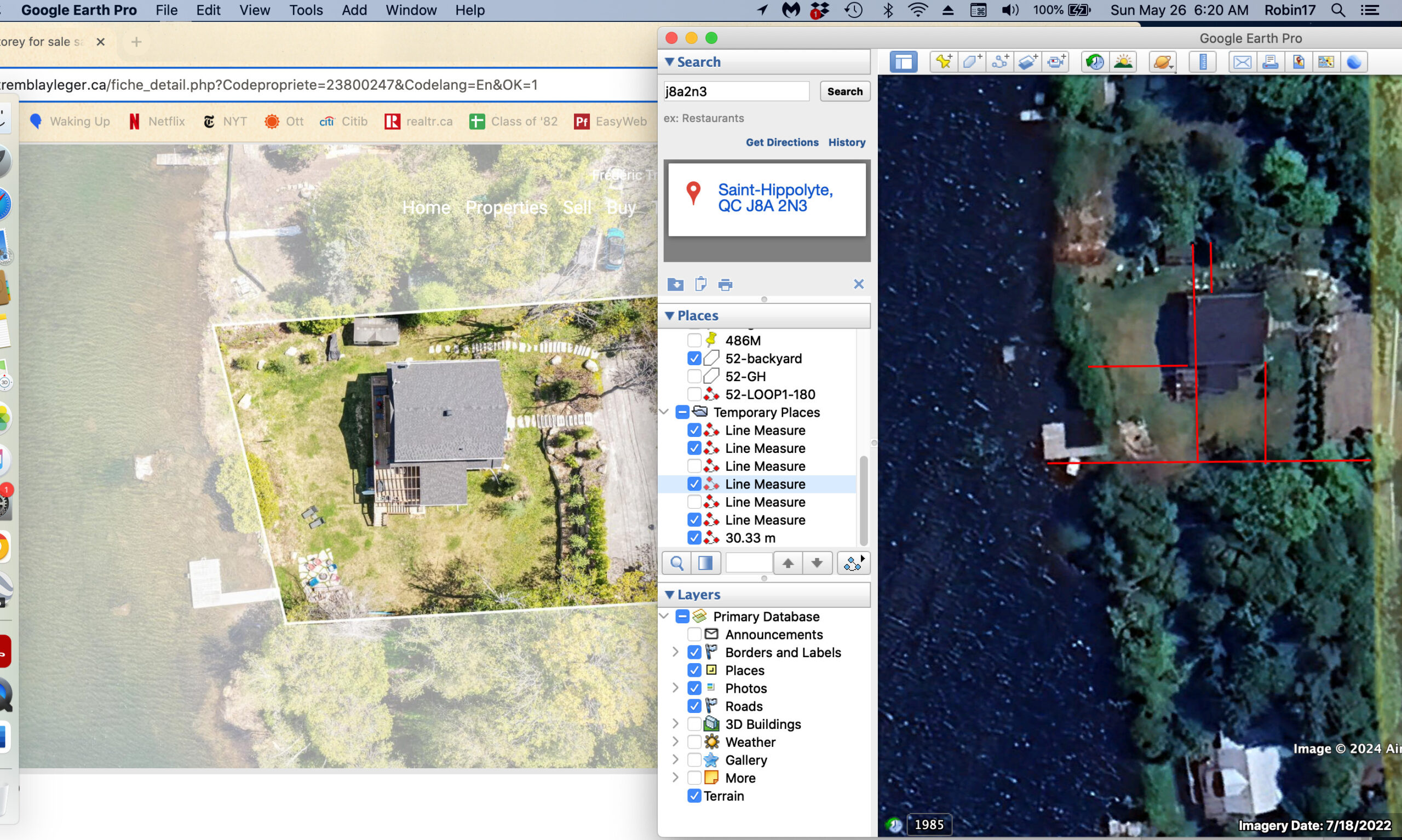 The photo on the right is taken from Google Earth, is dated 2022, and contains markings that I added. These markings are the measurements and angles taken from the 2019 property survey of #53.