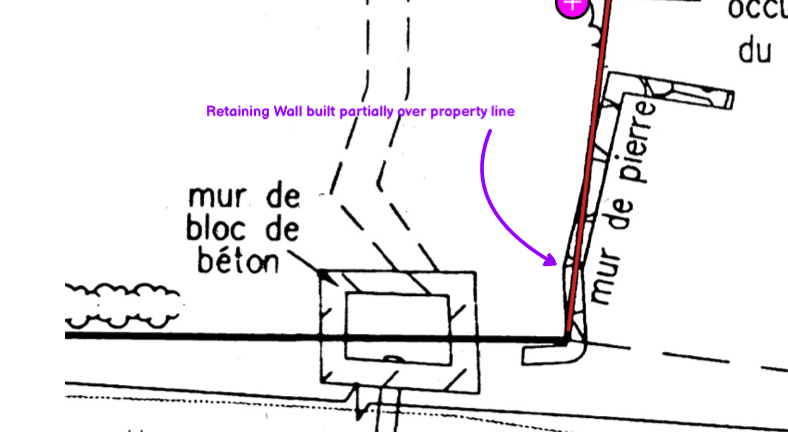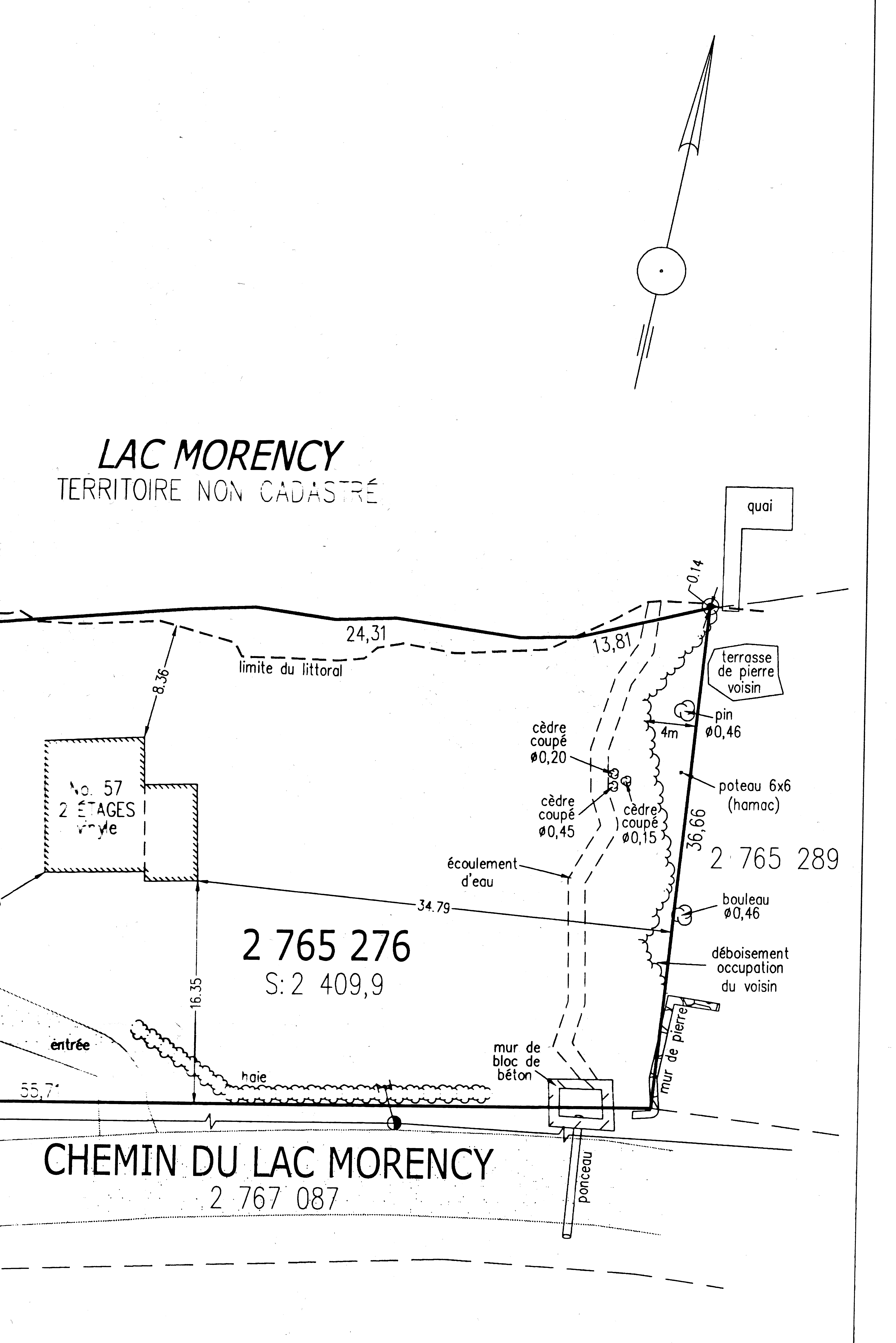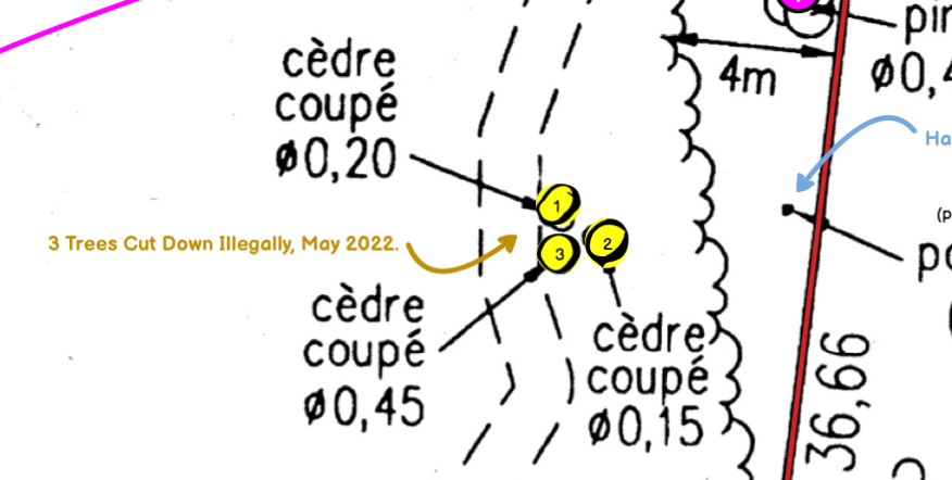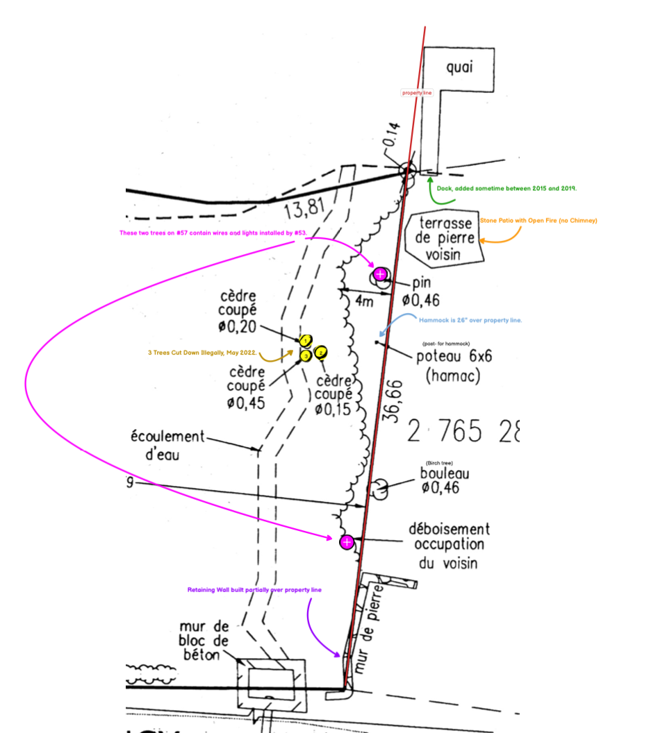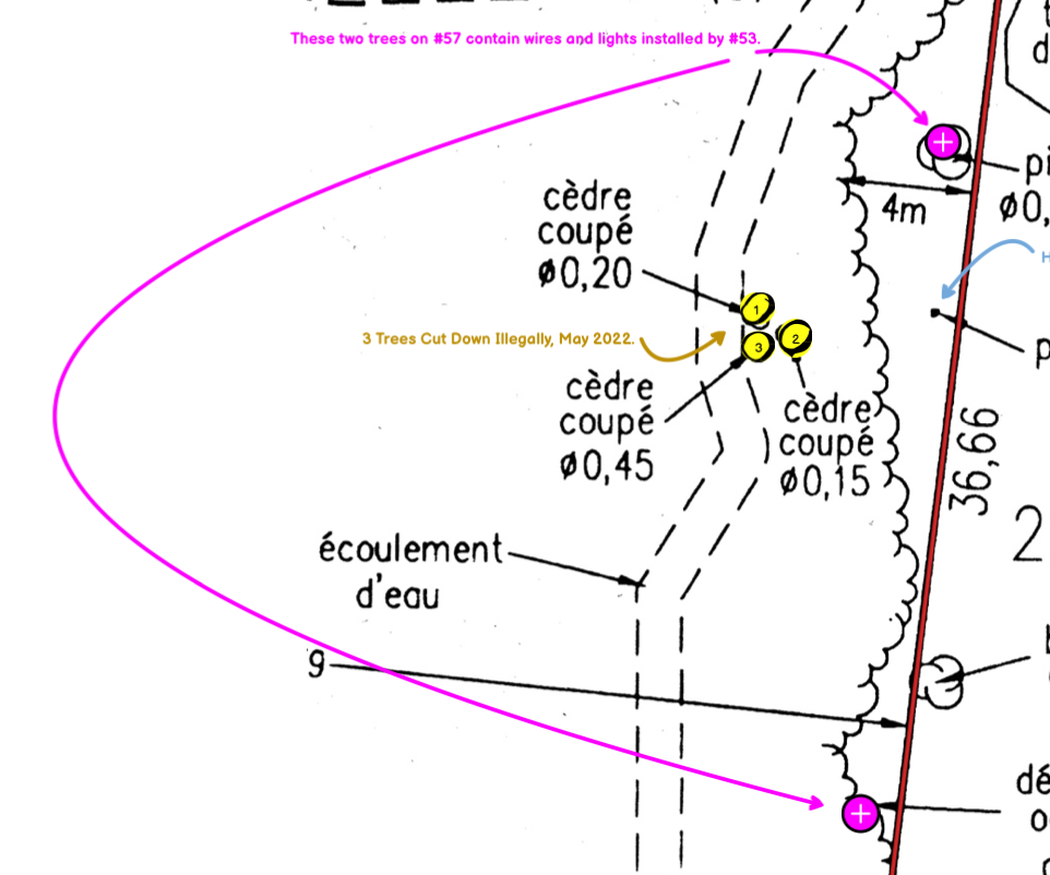 Below is enlargement of border between properties at 53 and at 57 Chemin du Lac Morency. Below that are more specific enlargements which illustrate one violation at a time.