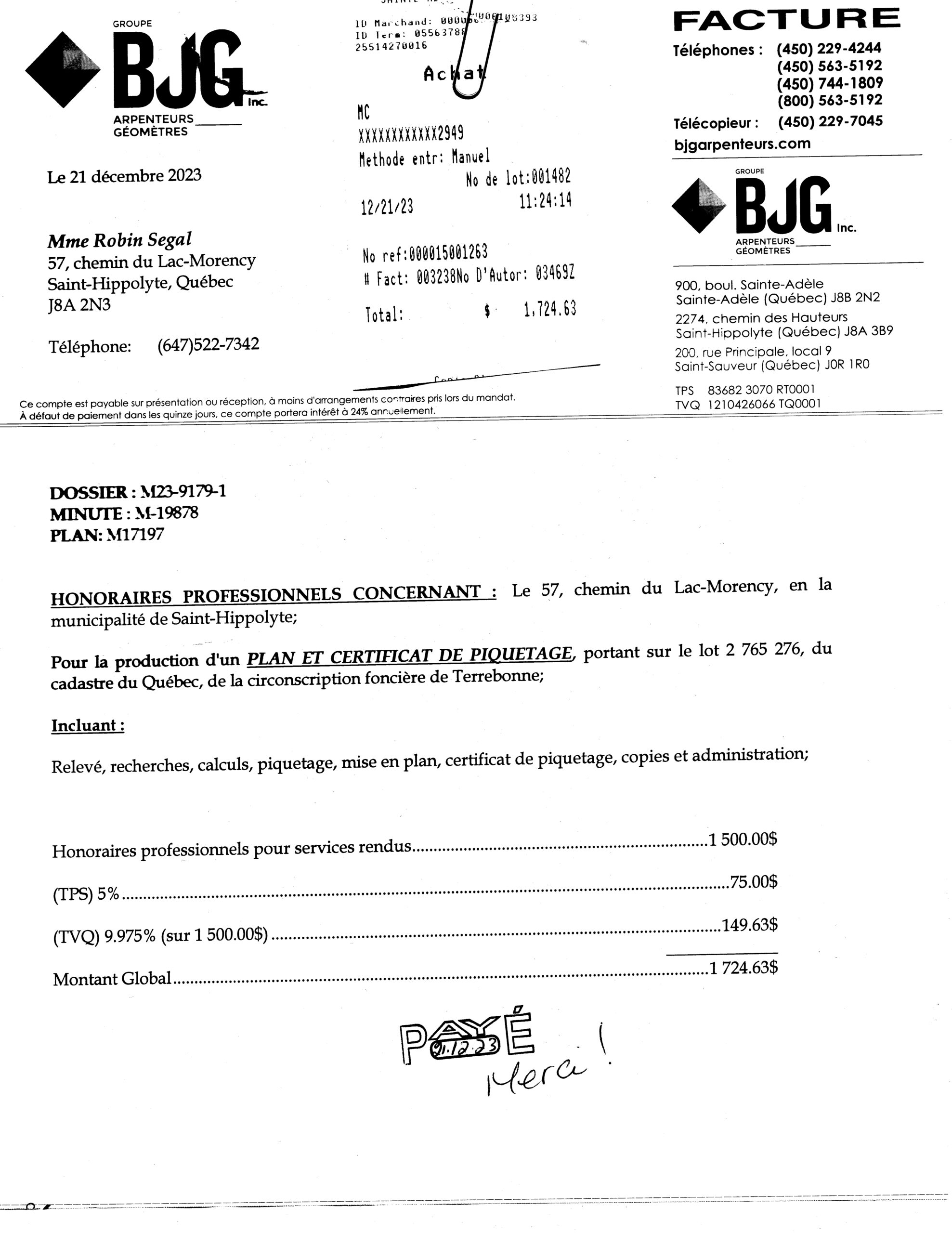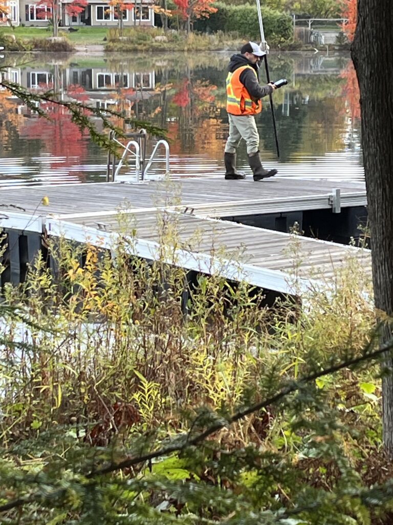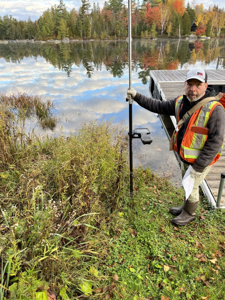 This is the surveyor who worked on Oct. 18, 2023. He measured many points and determined the boundary line between the properties (#53 and #57 Chemin du Lac Morency.) His work is represented in the official and licensed drawings appearing below these videos and photos. The two videos below are split and contain seconds of overlap to illustrate they are sequential. They show the surveyor finding an existing property marker underground.