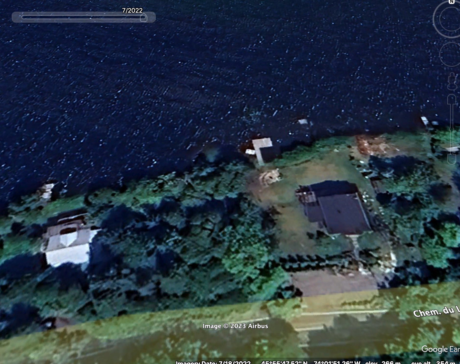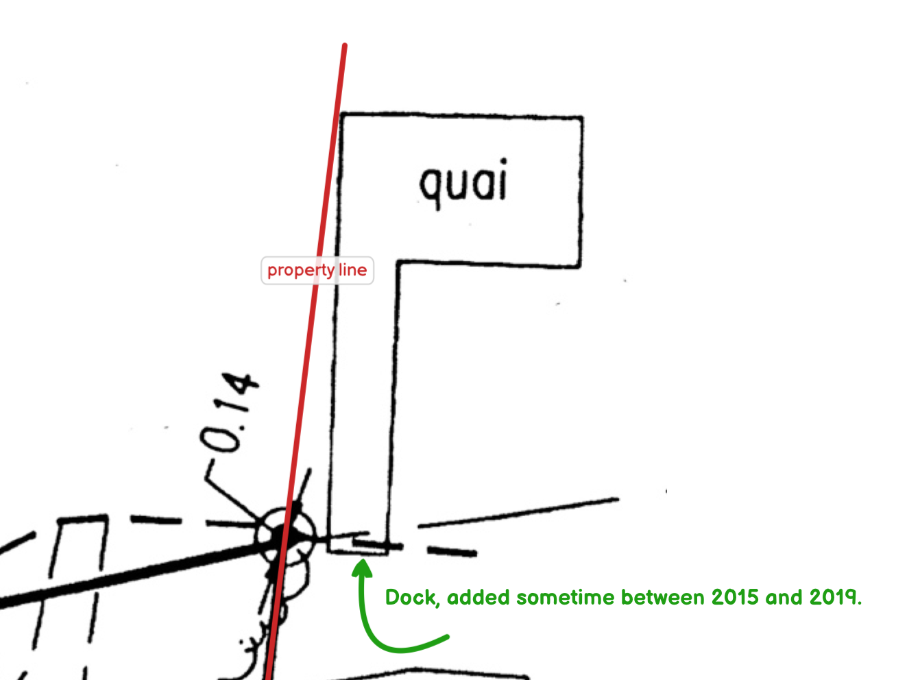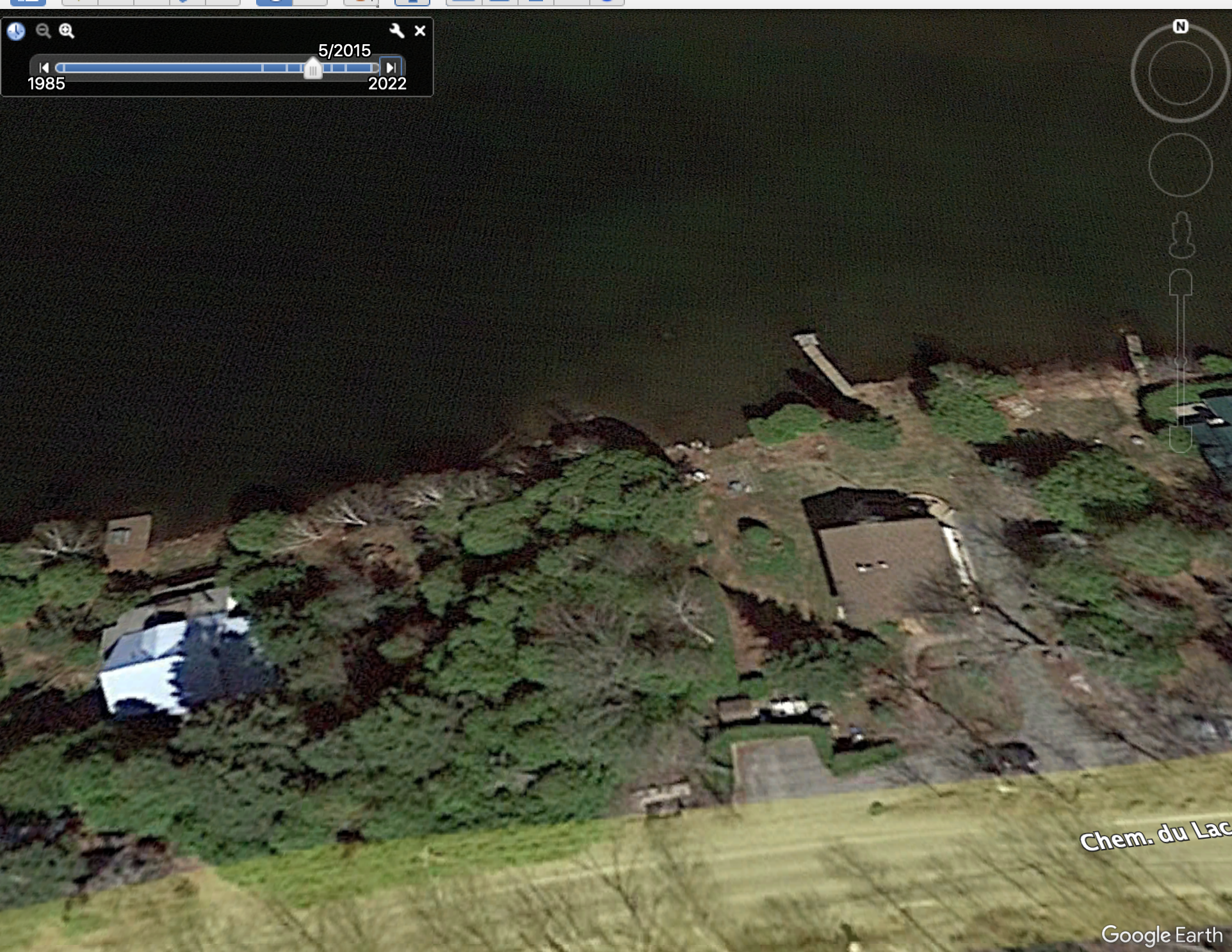 Between 2015 and 2019, previous owner of #53 (Paul Bernard, Jr,) removed the dock and replaced it with another one. Replacement was not in the same location. Previous dock, as seen in 2015 Google Earth photo, is roughly in centre of property’s lakeside border. Current (2024) dock, which was put in prior to end of 2019, is on the property line, as seen in 2022 google earth photo, and plotted using licensed survey work in 2023. [additional photo]