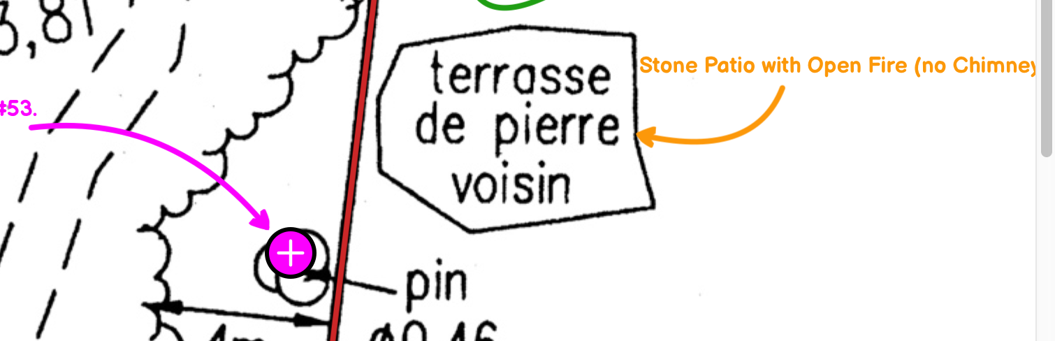 Saint-Hippolyte regulation 1196-20 (Chapter 5, Article 19, #10, (p.12 of document) requires open fireplaces to be 6 metres from a property line, and 6 metres from any forest. The open fireplace is situated about zero metres from the property line, and less than one metres from the forest, as plotted and rendered by licensed survey work, and photographed, in 2023.