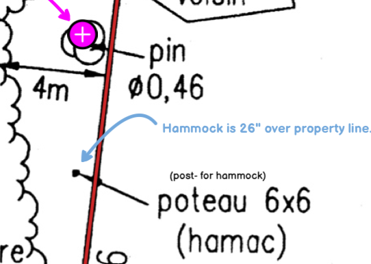 53 has installed a 6×6 post and hung a hammock entirely on #57 property. Post is 26″ over property line. Tree is entirely on #57 property also. (Hammock is hung from blue arrow point up to pink circle.